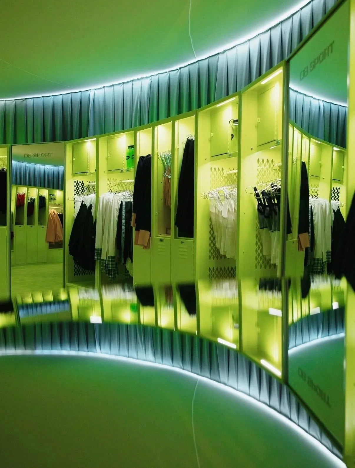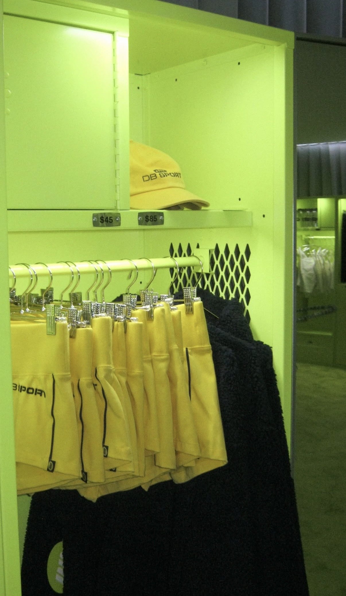 The pop-up itself was a perfect reflection of that evolution. The space felt like a locker room reimagined through a fashion lens. Bright neon yellows, greens, and creamy whites covered everything from the walls to the displays, while chrome racks and sporty accents added a clean, athletic edge. There were tennis inspired details, retro gym touches, and even subtle nods to track and field culture woven throughout the design.
